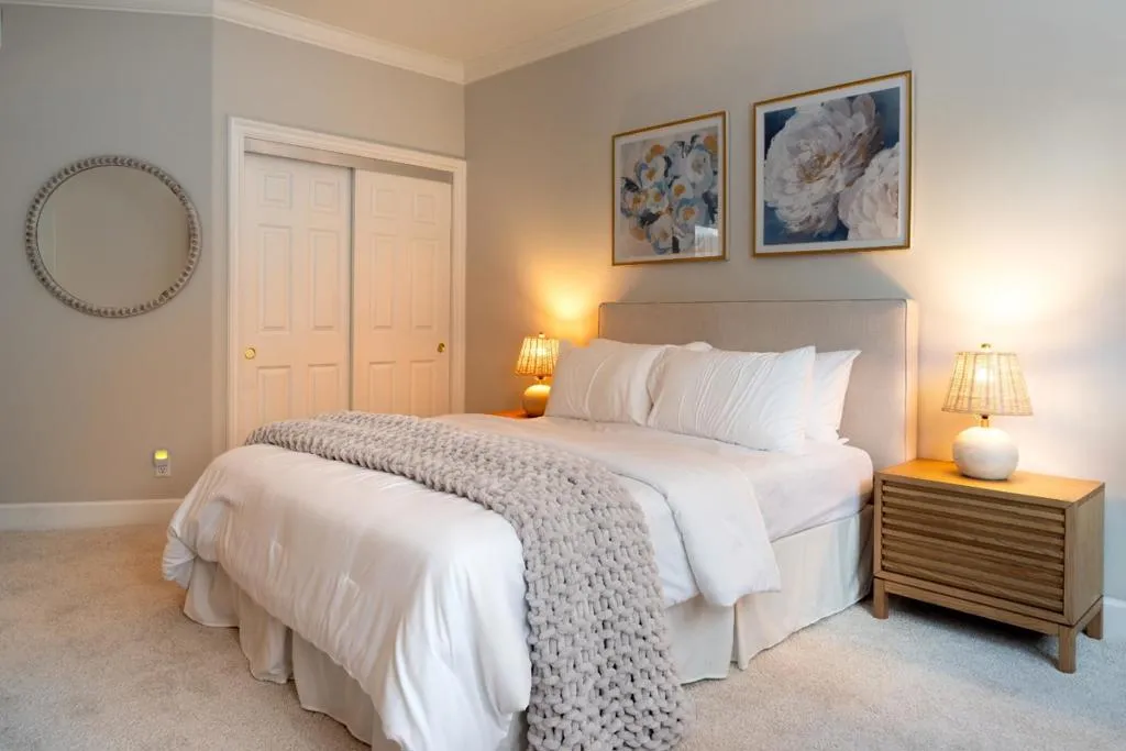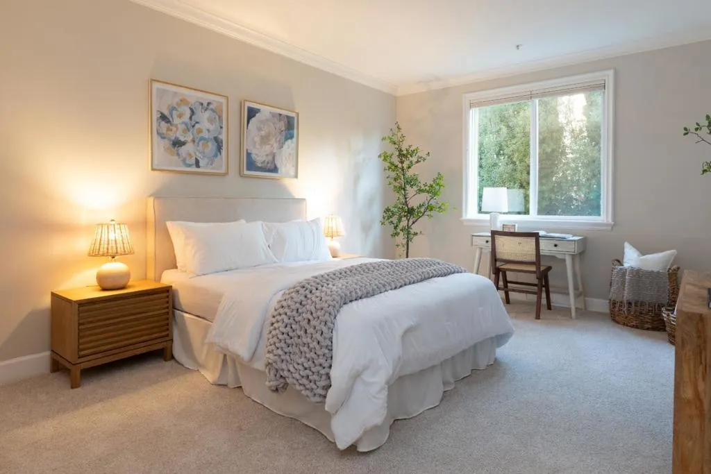 Welcome home! Located on a quiet street in the heart of Burlingame just half a block from Broadway's shops, restaurants, cafes, and a mile or so from Downtown Burlingame ave. This bright modern condo features laminate floors, brand new carpet in bedrooms. Kitchen with young appliances, bar counter, living and dining room with balcony for grilling or relaxing. The spacious master bedroom includes a walk in closet and attached dual sinks primary bath with walk in shower. In unit washer/dryer with extra storage space, brand new furnace, dedicated 2 parking spaces in secured underground garage with more garage storage. Boutique building built in 2001 with just 12 units. Caltrain, SFO, top schools, easy commute, charming neighborhood, this home has it all! Come and visit anytime!