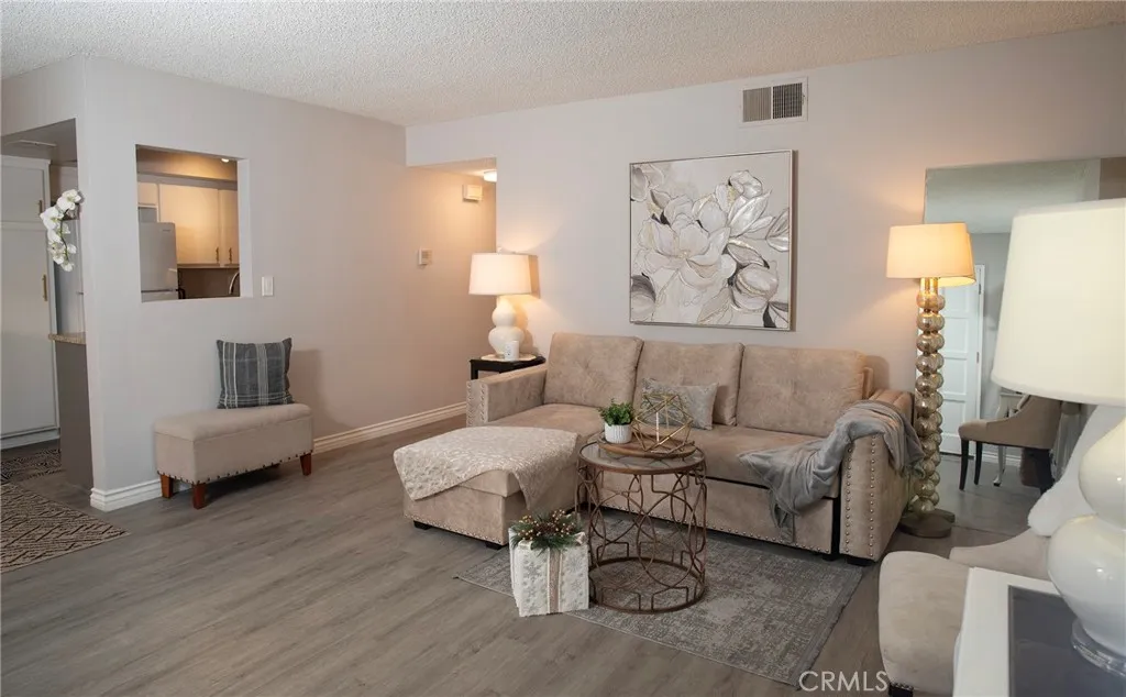Discover a hidden gem in this upgraded 2-bedroom, 2-bathroom corner condo in a serene gated community of just 40 units. This first-floor unit boasts a host of modern updates, including freshly painted kitchen cabinets, stylish newer handles, under-cabinet accent lighting with a dimmer switch, a newer faucet, sink, light fixture, refrigerator, stove, microwave, Formica countertops, and grey wood plank flooring in the kitchen that extends into the living room, and hallway. The principal bathroom features a newer granite vanity with dual sinks, updated plumbing, newer lighting, and sleek shower fixtures, while the hallway bathroom includes a newer vanity and fixtures. Additional enhancements include LED hallway lighting, baseboard molding throughout, shutters in both bedrooms, Berber carpet in the principal bedroom, and a water heater that is only four years old. Freshly painted interiors, in-door laundry, and ample storage space add to the appeal. The cozy patio is perfect for morning coffee while enjoying tranquil surroundings and mountain views. Conveniently located near the Duarte Trail, parks, and golf courses, this home offers easy access to outdoor activities. For added convenience, the condo includes two designated parking spots: one in a carport and the other in an uncovered space. Community amenities include a sparkling pool, spa, barbecue area, and lush courtyard, and HOA fees cover water, trash, and maintenance. This turnkey home is also near shops, restaurants, freeways, public transportation, the City of Hope, and highly rated schools, including Royal Oaks Elementary, Duarte High School, and California School of the Arts. Combining modern upgrades, natural light, and a prime location, this condo is a must-see!