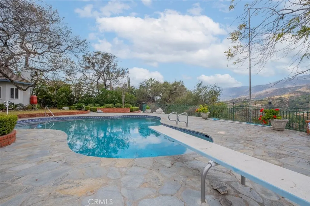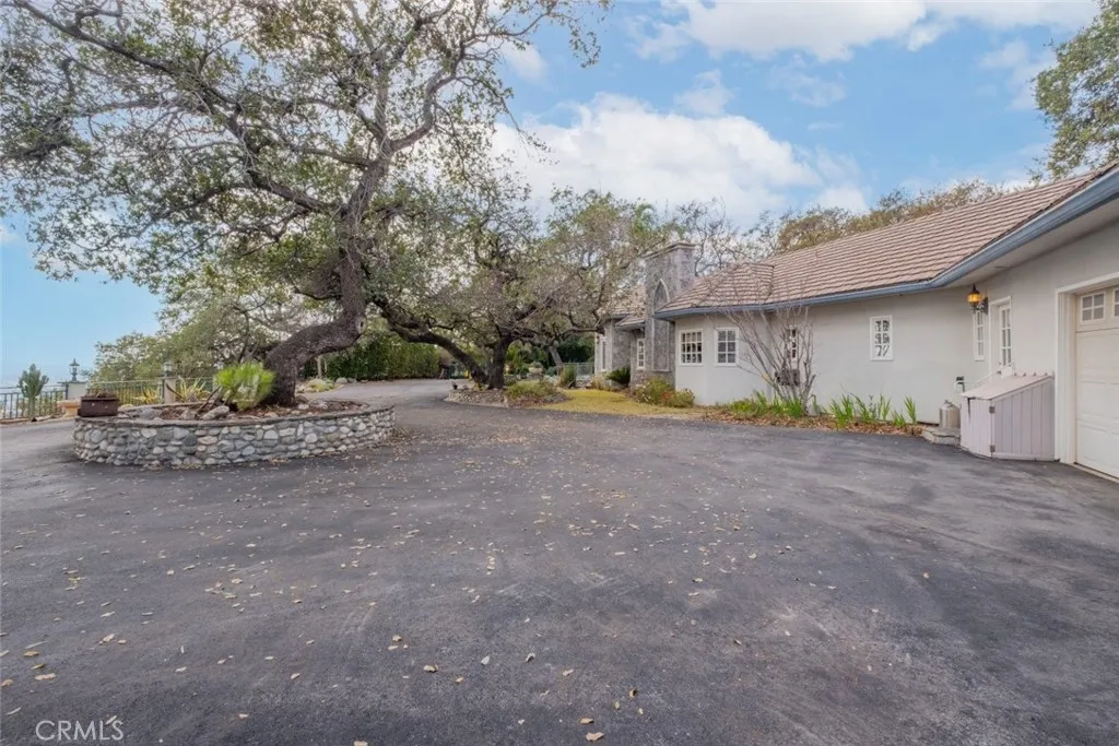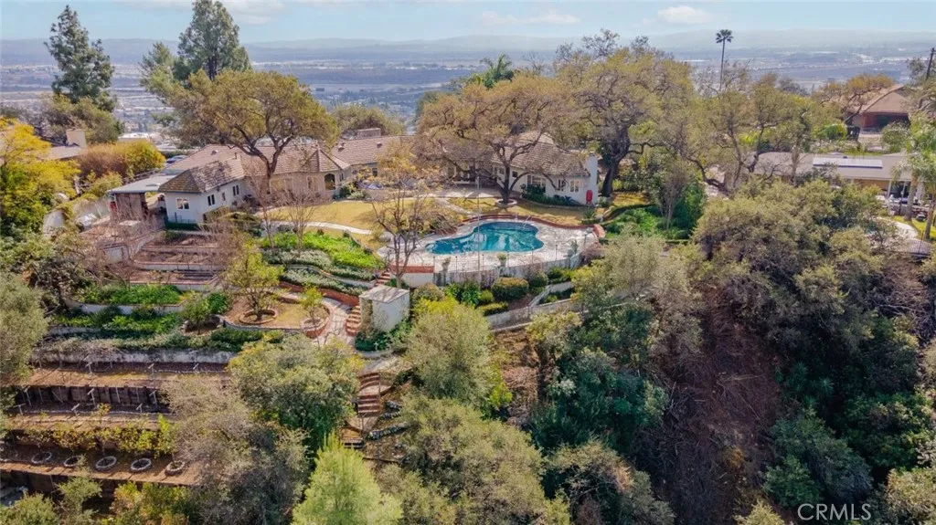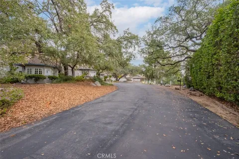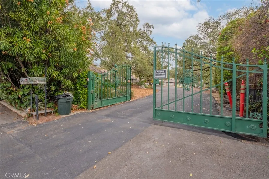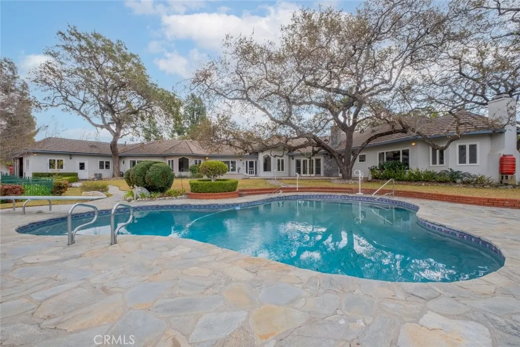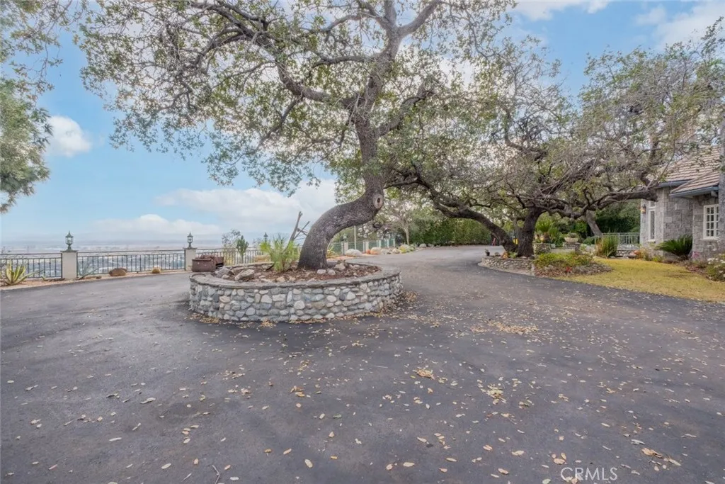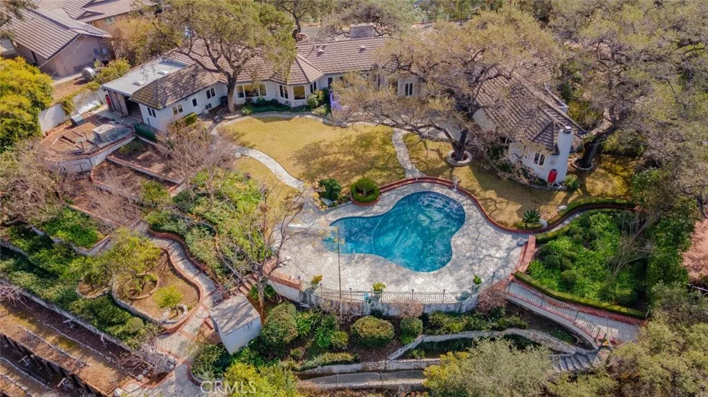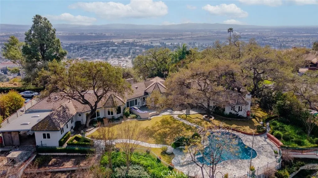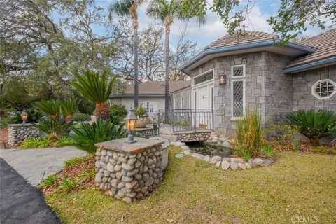 Tucked behind the gates of exclusive Bradbury Oaks Estates, this stunning sanctuary offers unparalleled privacy, elegance, and breathtaking 360-degree canyon & city light views. Situated on over two acres of beautifully landscaped grounds, the property features majestic oak trees, fruit trees, and terraced back gardens. A private road and gated driveway leads to an expansive Chateau that was reimagined in 1995, with grand cut-stone and stucco fa ade, where an octagonal entry with leaded glass sidelights and transom sets a sophisticated tone. A picturesque stone bridge over a koi pond with wrought iron and river rock accents welcomes you home. Inside, the elegant formal foyer showcases inlaid marble flooring, custom stenciling, and arched doorways. The step-down formal living room features a corner fireplace, wall sconces, carpeting, and French doors leading to the backyard. The intimate family room offers beamed ceilings, a grey brick fireplace, cherry wood flooring, and an octagonal window. The French Normandy style gourmet kitchen is a chef s delight, complete with a center island with prep sink, granite countertops, stone tile flooring, ample custom wood cabinetry, a built-in Sub-Zero refrigerator, a six-burner Russell Range cooktop with hood, built-in oven and microwave, and an attached breakfast room. The octagonal formal dining room exudes elegance with marble flooring and black inlay. The west wing includes a spacious bedroom/office with built-in workspace with mirrored closet doors, a hallway bath with a jetted tub & ample linen storage, as well as a luxurious primary suite featuring a built-in dresser, wet bar, walk-in closet, a fireplace, and a spa-like bath with dual sinks, a jetted tub, and separate shower. The east wing offers another well-appointed bedroom, a bathroom with jetted tub and brass fixtures, and access to the attached 2-car garage with a rear pass-through door. The expansive backyard is an entertainer s dream, boasting a large swimming pool with diving board, an outdoor kitchen & BBQ area, an inviting stone patio, brick-accented sidewalks, and a charming tree swing. A gated circular driveway offers ample parking. Additional highlights include an underground wine cellar, separate laundry room, concrete tile lifetime roof, central air & heat, recessed lighting, central vacuum, custom window coverings, and water softening system. This exceptional estate blends luxury, comfort, and natural beauty in a prestigious setting!