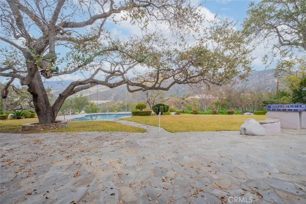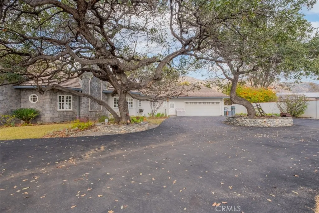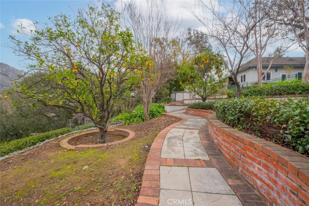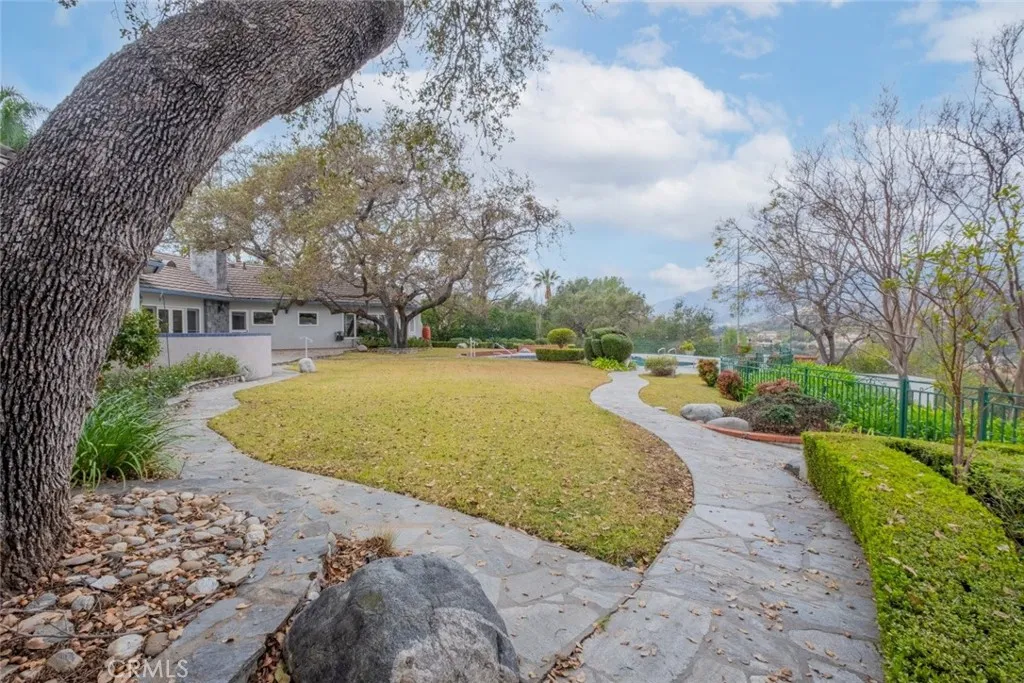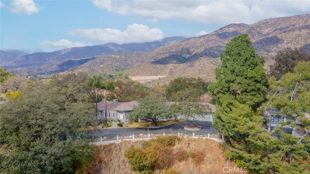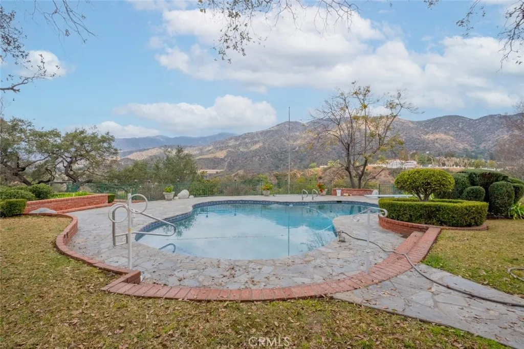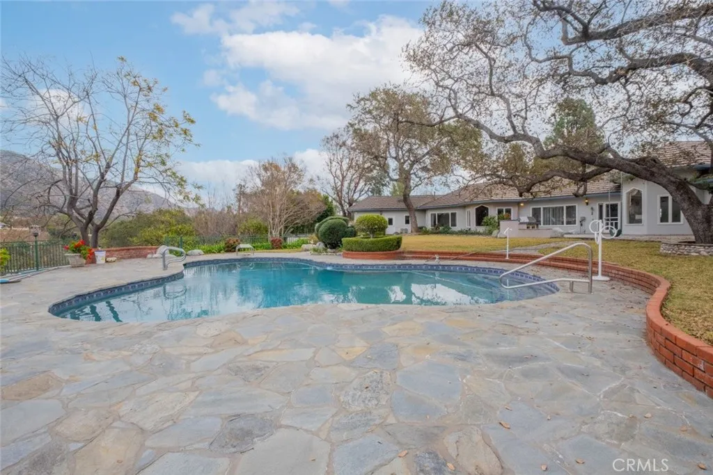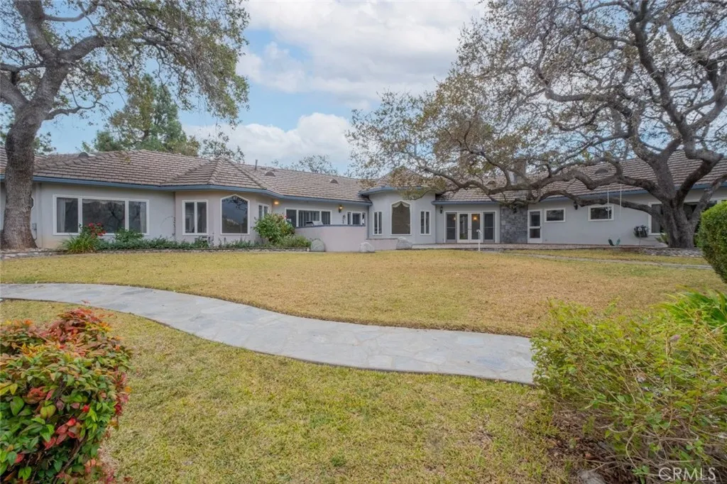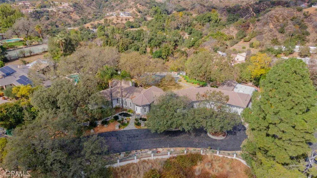 Tucked behind the gates of exclusive Bradbury Oaks Estates, this stunning sanctuary offers unparalleled privacy, elegance, and breathtaking 360-degree canyon & city light views. Situated on over two acres of beautifully landscaped grounds, the property features majestic oak trees, fruit trees, and terraced back gardens. A private road and gated driveway leads to an expansive Chateau that was reimagined in 1995, with grand cut-stone and stucco fa ade, where an octagonal entry with leaded glass sidelights and transom sets a sophisticated tone. A picturesque stone bridge over a koi pond with wrought iron and river rock accents welcomes you home. Inside, the elegant formal foyer showcases inlaid marble flooring, custom stenciling, and arched doorways. The step-down formal living room features a corner fireplace, wall sconces, carpeting, and French doors leading to the backyard. The intimate family room offers beamed ceilings, a grey brick fireplace, cherry wood flooring, and an octagonal window. The French Normandy style gourmet kitchen is a chef s delight, complete with a center island with prep sink, granite countertops, stone tile flooring, ample custom wood cabinetry, a built-in Sub-Zero refrigerator, a six-burner Russell Range cooktop with hood, built-in oven and microwave, and an attached breakfast room. The octagonal formal dining room exudes elegance with marble flooring and black inlay. The west wing includes a spacious bedroom/office with built-in workspace with mirrored closet doors, a hallway bath with a jetted tub & ample linen storage, as well as a luxurious primary suite featuring a built-in dresser, wet bar, walk-in closet, a fireplace, and a spa-like bath with dual sinks, a jetted tub, and separate shower. The east wing offers another well-appointed bedroom, a bathroom with jetted tub and brass fixtures, and access to the attached 2-car garage with a rear pass-through door. The expansive backyard is an entertainer s dream, boasting a large swimming pool with diving board, an outdoor kitchen & BBQ area, an inviting stone patio, brick-accented sidewalks, and a charming tree swing. A gated circular driveway offers ample parking. Additional highlights include an underground wine cellar, separate laundry room, concrete tile lifetime roof, central air & heat, recessed lighting, central vacuum, custom window coverings, and water softening system. This exceptional estate blends luxury, comfort, and natural beauty in a prestigious setting!