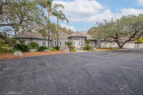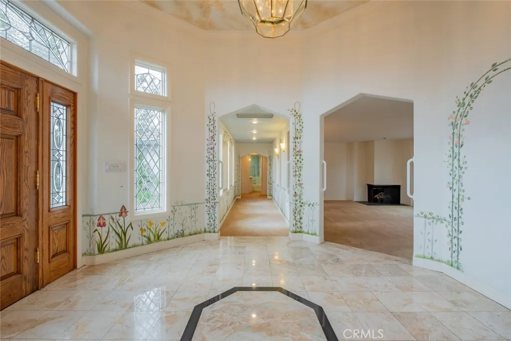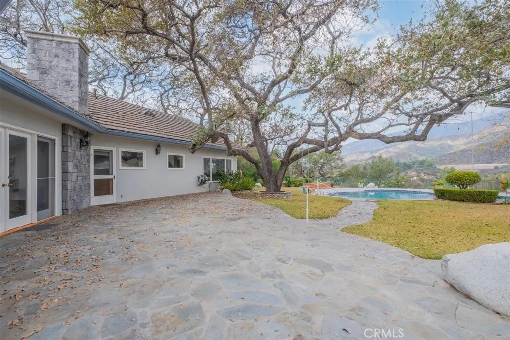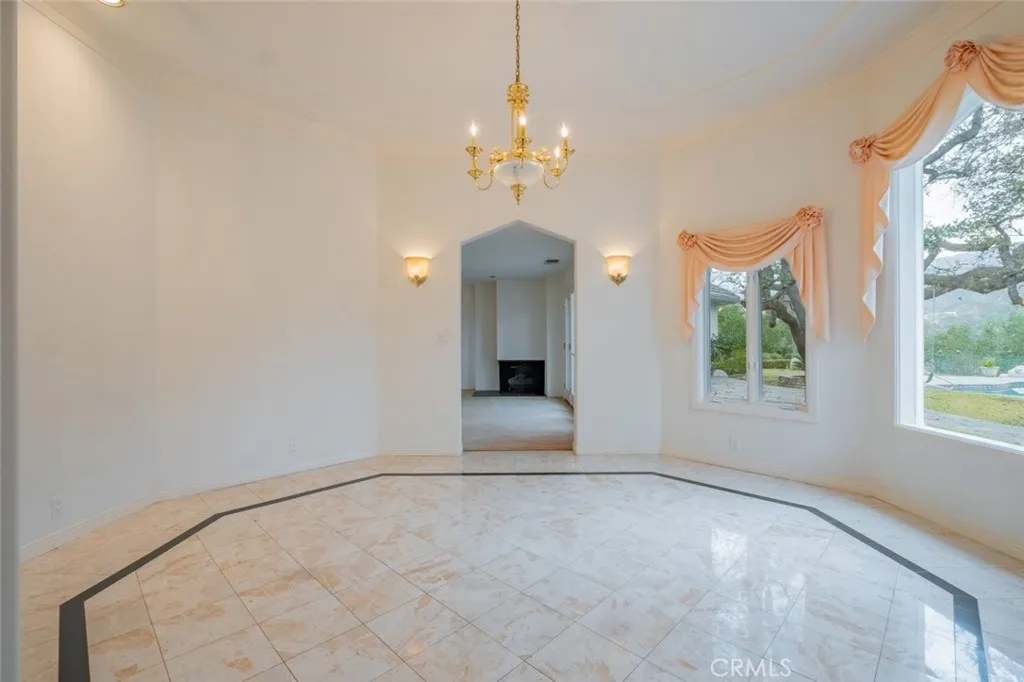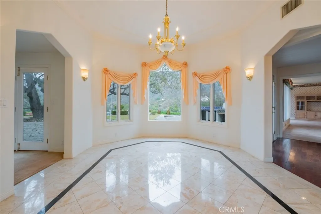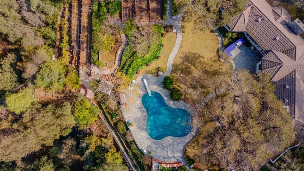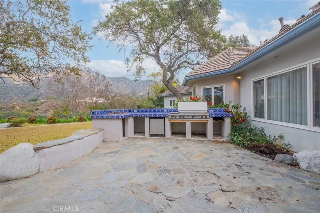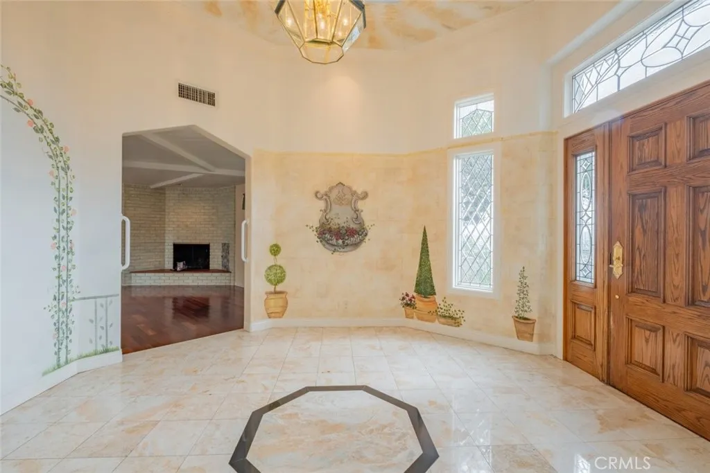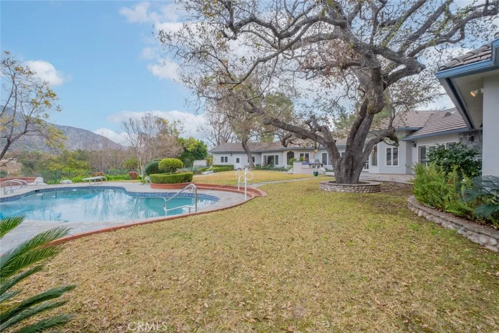 Tucked behind the gates of exclusive Bradbury Oaks Estates, this stunning sanctuary offers unparalleled privacy, elegance, and breathtaking 360-degree canyon & city light views. Situated on over two acres of beautifully landscaped grounds, the property features majestic oak trees, fruit trees, and terraced back gardens. A private road and gated driveway leads to an expansive Chateau that was reimagined in 1995, with grand cut-stone and stucco fa ade, where an octagonal entry with leaded glass sidelights and transom sets a sophisticated tone. A picturesque stone bridge over a koi pond with wrought iron and river rock accents welcomes you home. Inside, the elegant formal foyer showcases inlaid marble flooring, custom stenciling, and arched doorways. The step-down formal living room features a corner fireplace, wall sconces, carpeting, and French doors leading to the backyard. The intimate family room offers beamed ceilings, a grey brick fireplace, cherry wood flooring, and an octagonal window. The French Normandy style gourmet kitchen is a chef s delight, complete with a center island with prep sink, granite countertops, stone tile flooring, ample custom wood cabinetry, a built-in Sub-Zero refrigerator, a six-burner Russell Range cooktop with hood, built-in oven and microwave, and an attached breakfast room. The octagonal formal dining room exudes elegance with marble flooring and black inlay. The west wing includes a spacious bedroom/office with built-in workspace with mirrored closet doors, a hallway bath with a jetted tub & ample linen storage, as well as a luxurious primary suite featuring a built-in dresser, wet bar, walk-in closet, a fireplace, and a spa-like bath with dual sinks, a jetted tub, and separate shower. The east wing offers another well-appointed bedroom, a bathroom with jetted tub and brass fixtures, and access to the attached 2-car garage with a rear pass-through door. The expansive backyard is an entertainer s dream, boasting a large swimming pool with diving board, an outdoor kitchen & BBQ area, an inviting stone patio, brick-accented sidewalks, and a charming tree swing. A gated circular driveway offers ample parking. Additional highlights include an underground wine cellar, separate laundry room, concrete tile lifetime roof, central air & heat, recessed lighting, central vacuum, custom window coverings, and water softening system. This exceptional estate blends luxury, comfort, and natural beauty in a prestigious setting!