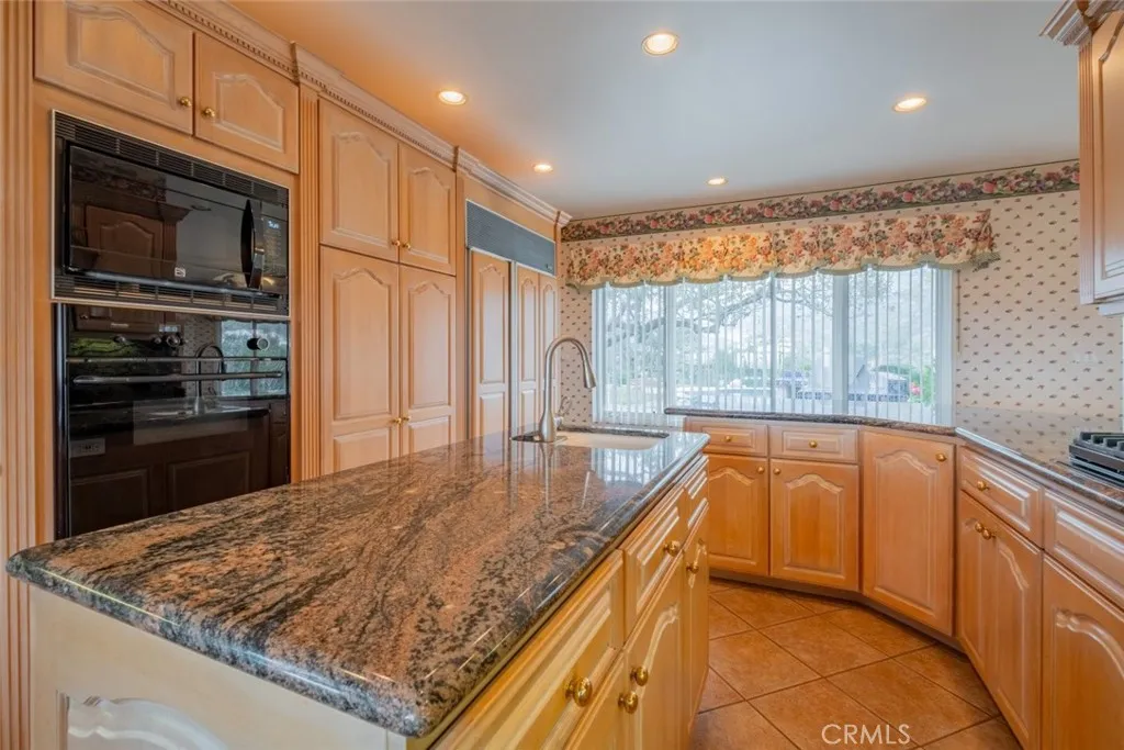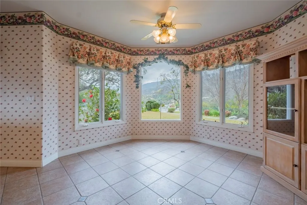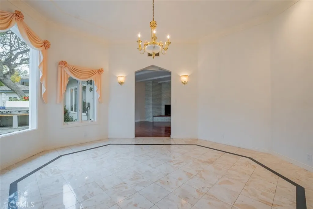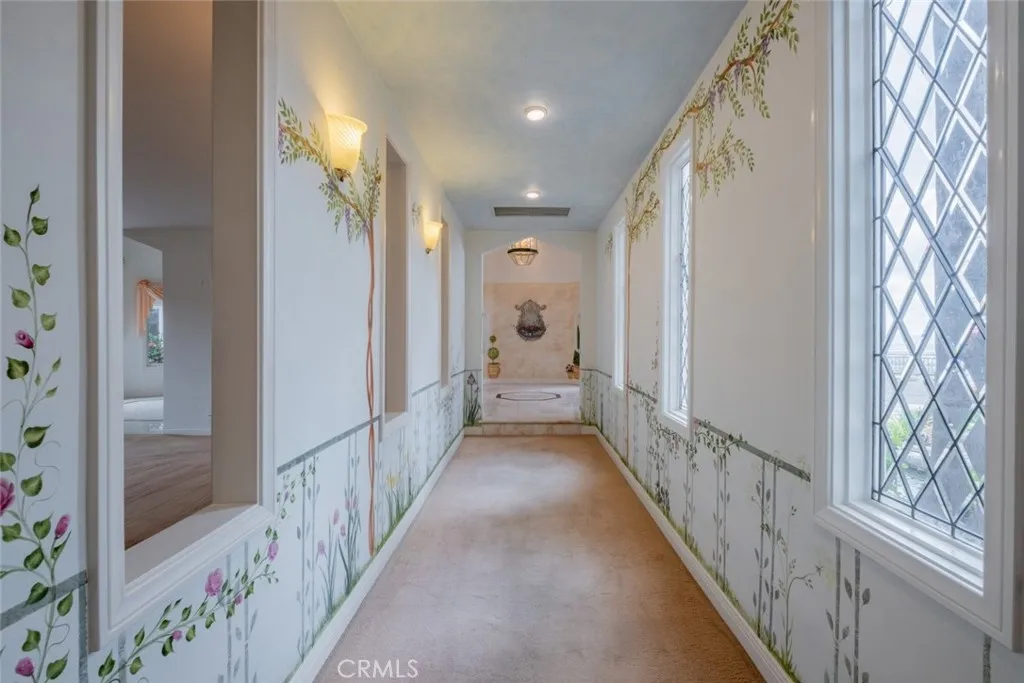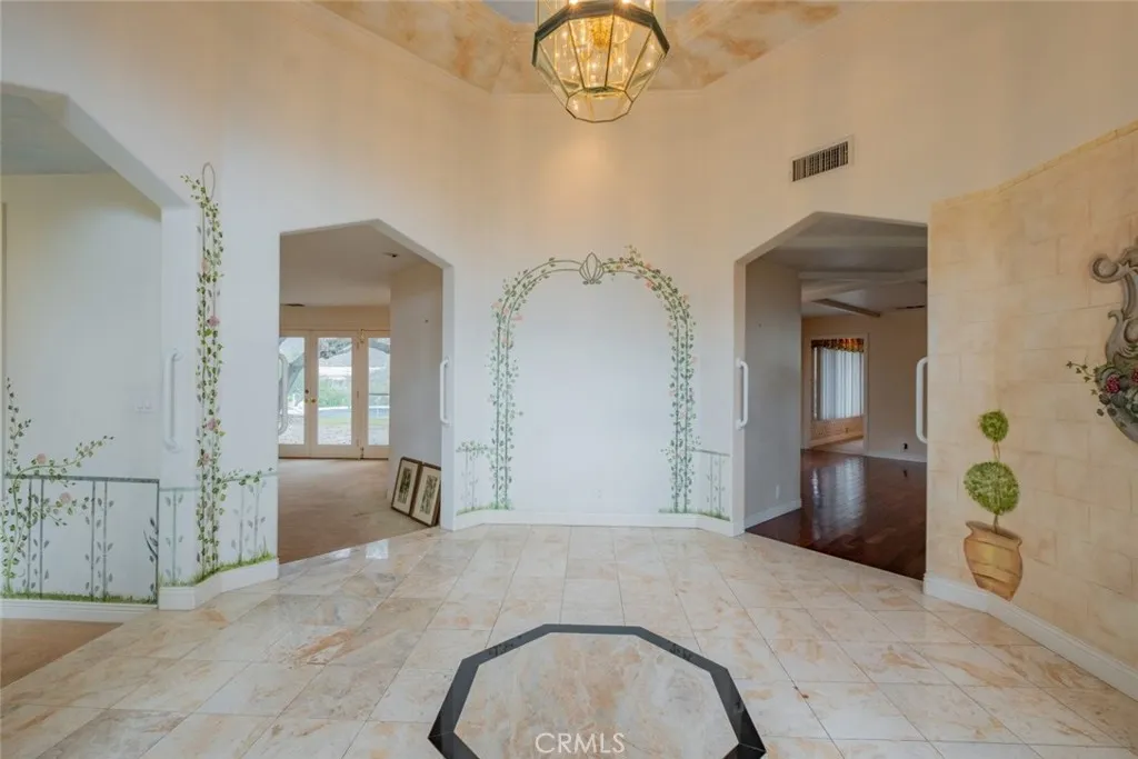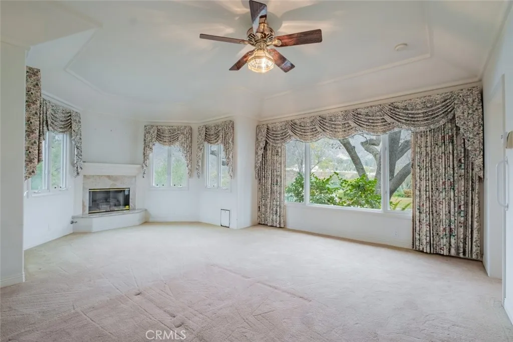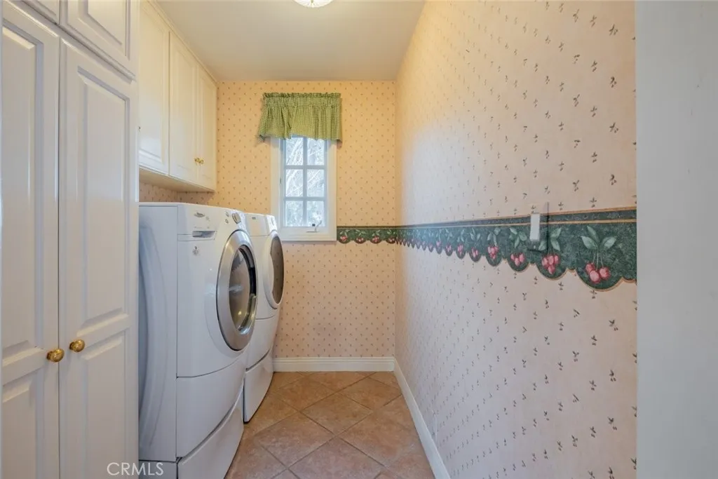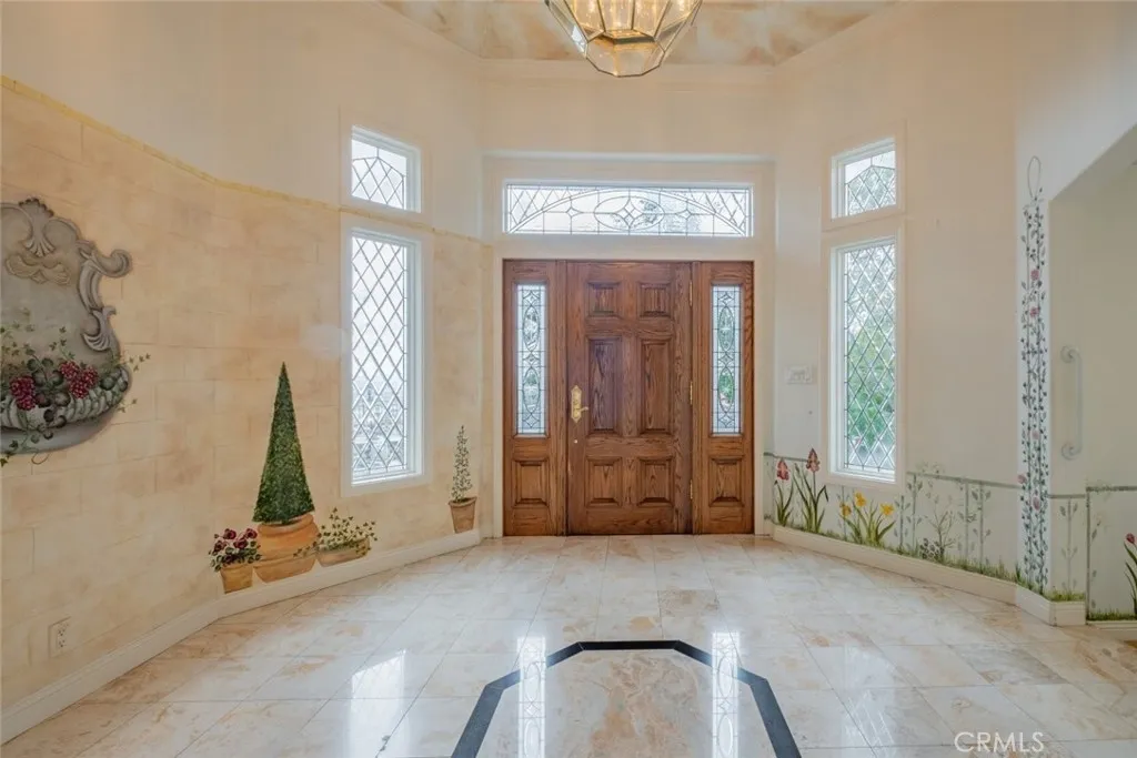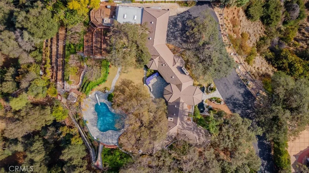 Tucked behind the gates of exclusive Bradbury Oaks Estates, this stunning sanctuary offers unparalleled privacy, elegance, and breathtaking 360-degree canyon & city light views. Situated on over two acres of beautifully landscaped grounds, the property features majestic oak trees, fruit trees, and terraced back gardens. A private road and gated driveway leads to an expansive Chateau that was reimagined in 1995, with grand cut-stone and stucco fa ade, where an octagonal entry with leaded glass sidelights and transom sets a sophisticated tone. A picturesque stone bridge over a koi pond with wrought iron and river rock accents welcomes you home. Inside, the elegant formal foyer showcases inlaid marble flooring, custom stenciling, and arched doorways. The step-down formal living room features a corner fireplace, wall sconces, carpeting, and French doors leading to the backyard. The intimate family room offers beamed ceilings, a grey brick fireplace, cherry wood flooring, and an octagonal window. The French Normandy style gourmet kitchen is a chef s delight, complete with a center island with prep sink, granite countertops, stone tile flooring, ample custom wood cabinetry, a built-in Sub-Zero refrigerator, a six-burner Russell Range cooktop with hood, built-in oven and microwave, and an attached breakfast room. The octagonal formal dining room exudes elegance with marble flooring and black inlay. The west wing includes a spacious bedroom/office with built-in workspace with mirrored closet doors, a hallway bath with a jetted tub & ample linen storage, as well as a luxurious primary suite featuring a built-in dresser, wet bar, walk-in closet, a fireplace, and a spa-like bath with dual sinks, a jetted tub, and separate shower. The east wing offers another well-appointed bedroom, a bathroom with jetted tub and brass fixtures, and access to the attached 2-car garage with a rear pass-through door. The expansive backyard is an entertainer s dream, boasting a large swimming pool with diving board, an outdoor kitchen & BBQ area, an inviting stone patio, brick-accented sidewalks, and a charming tree swing. A gated circular driveway offers ample parking. Additional highlights include an underground wine cellar, separate laundry room, concrete tile lifetime roof, central air & heat, recessed lighting, central vacuum, custom window coverings, and water softening system. This exceptional estate blends luxury, comfort, and natural beauty in a prestigious setting!