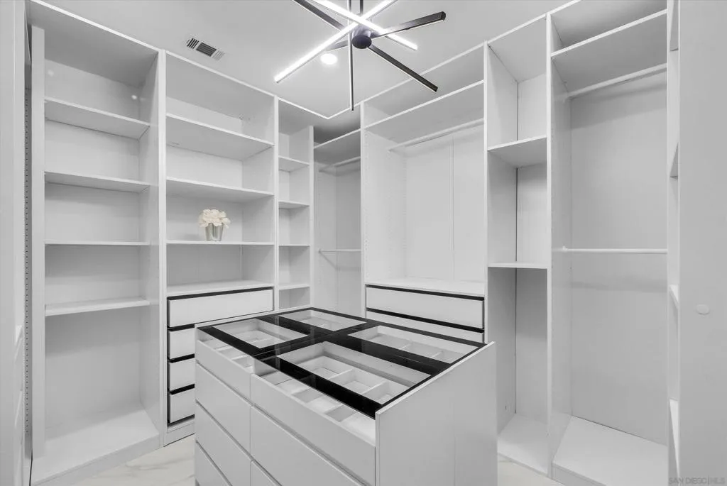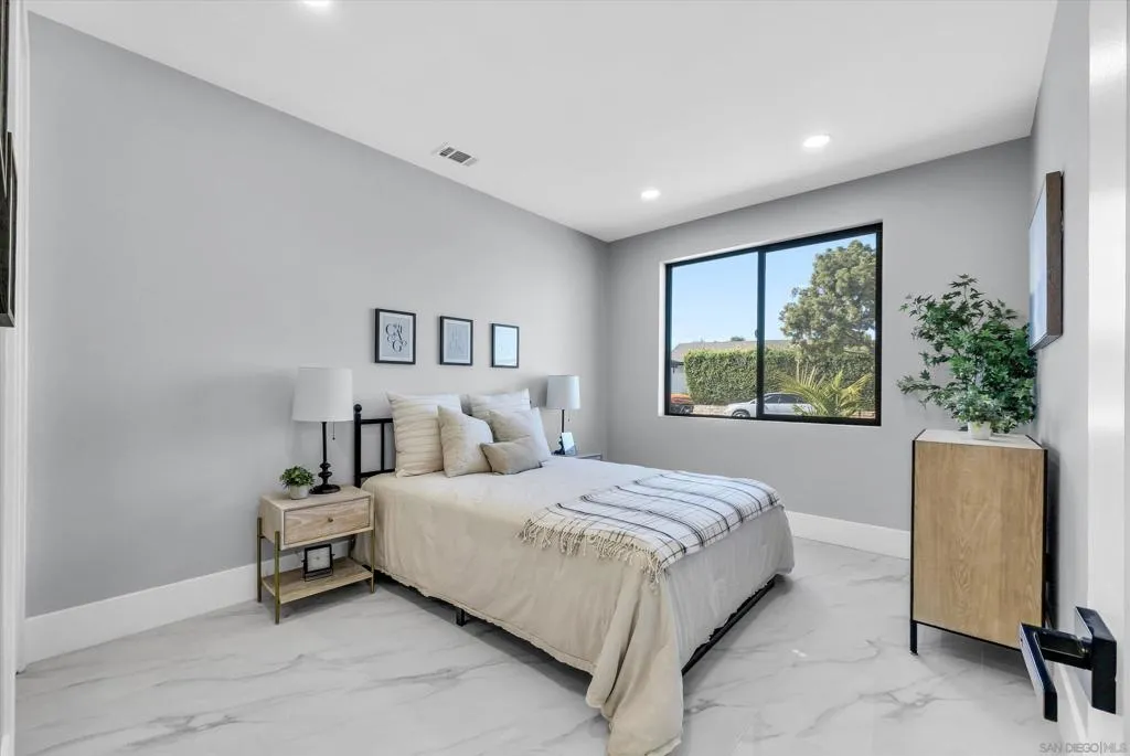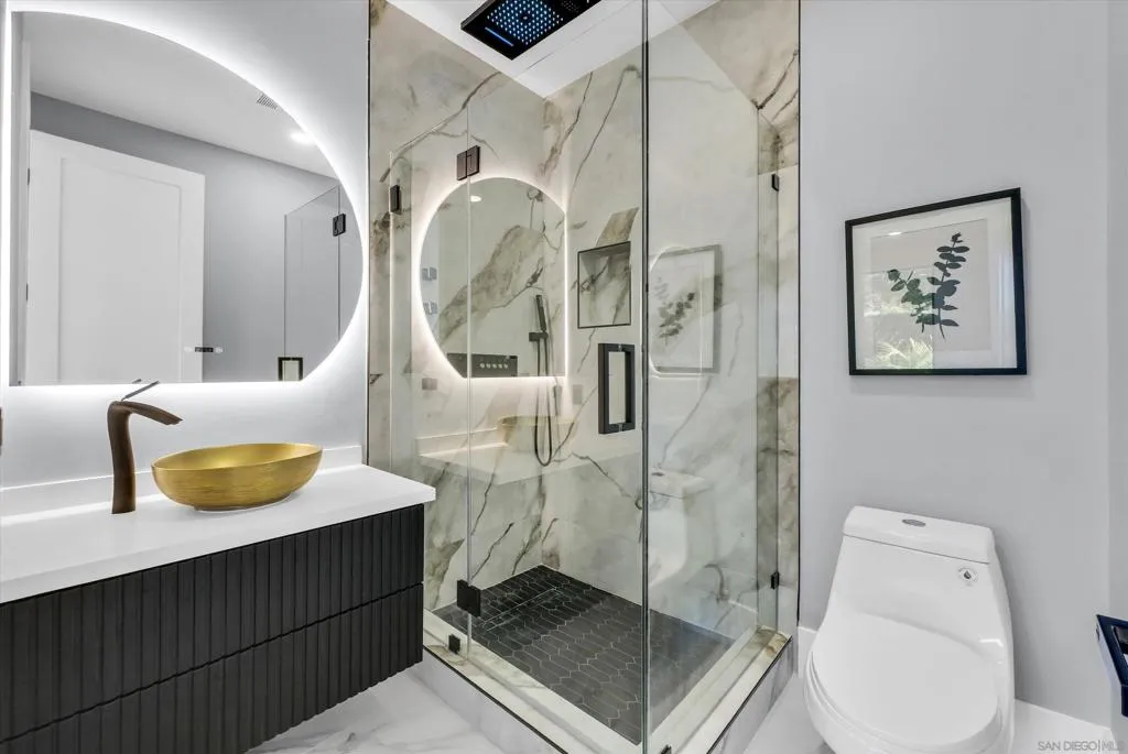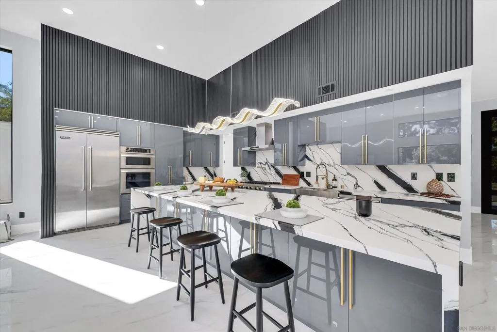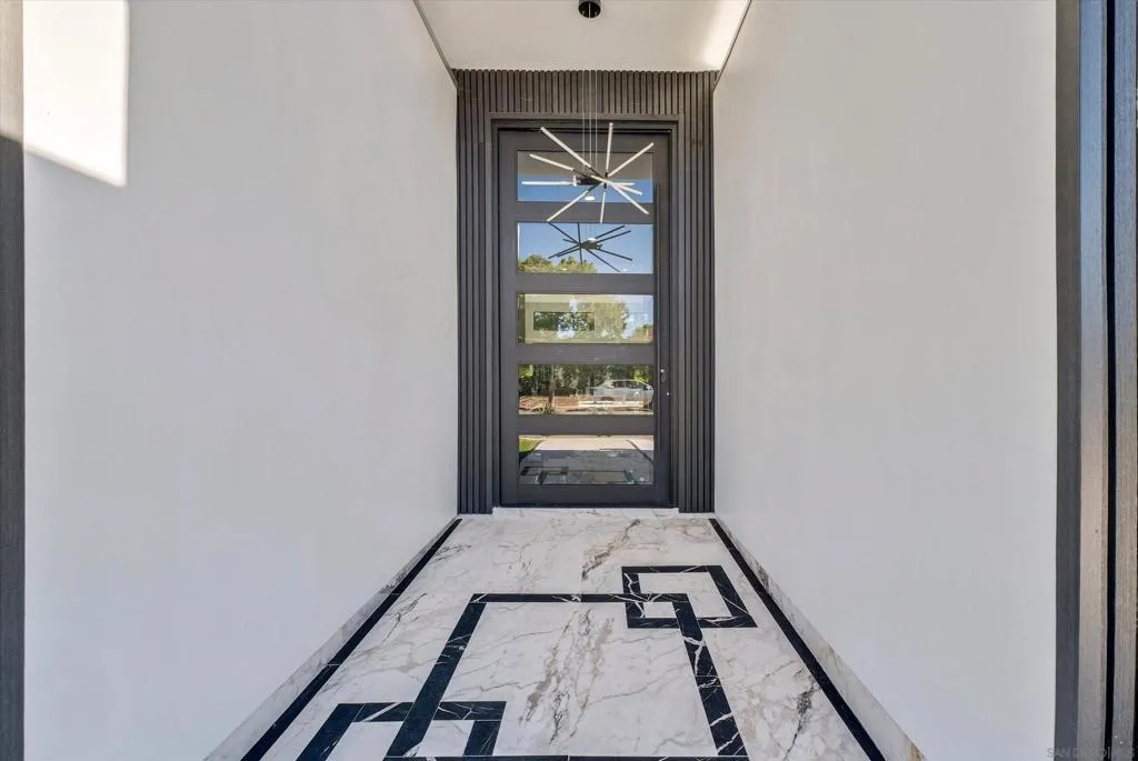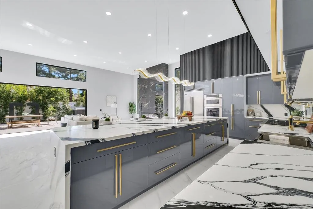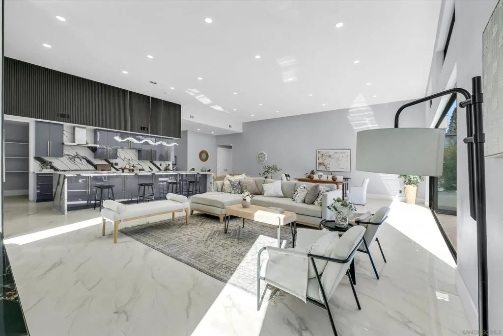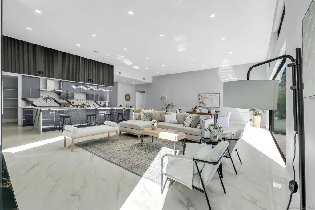 A stunning architectural masterpiece blending modern design with luxury comfort. This fully renovated single-story home showcases soaring ceilings, sleek porcelain floors, and an open-concept great room that flows seamlessly to an entertainer's patio through massive glass doors. The gourmet kitchen features custom cabinetry, waterfall marble counters, and designer lighting. The primary suite offers a spa-inspired bath with freestanding tub, rainfall shower, and LED backlit mirrors, plus a custom-built walk-in closet. Every detail - from the linear LED fixtures to gold-accented hardware - reflects sophisticated craftsmanship. Low-maintenance landscaping, sleek curb appeal, and a modern glass garage door complete this exceptional residence - perfectly designed for today's lifest