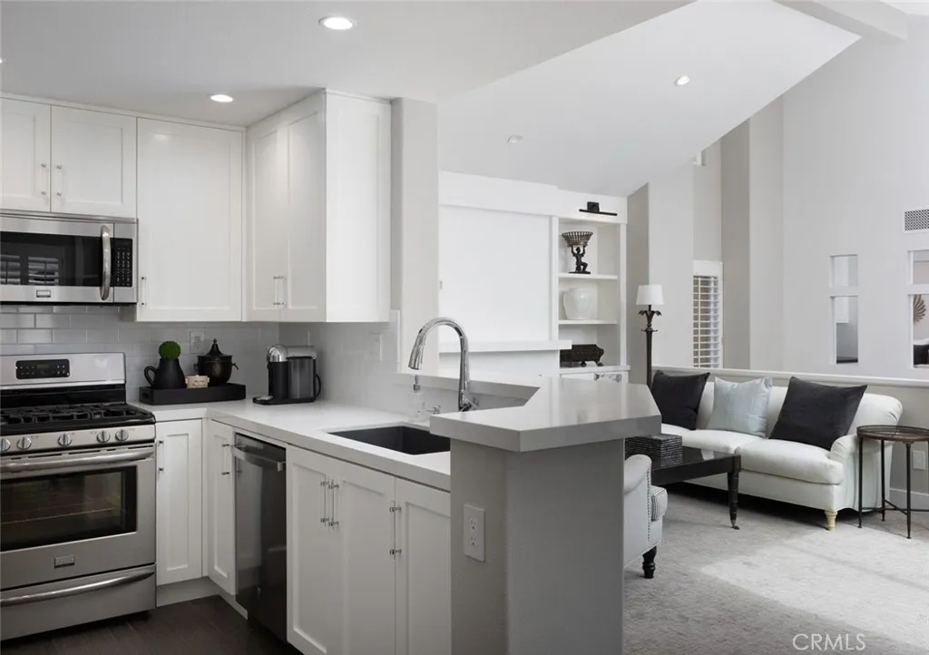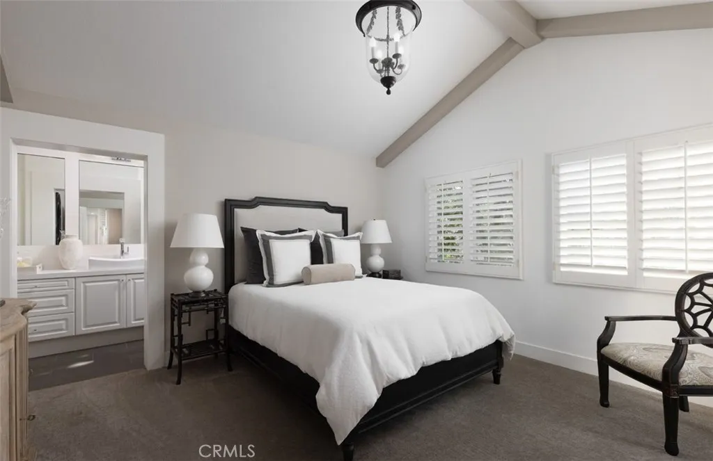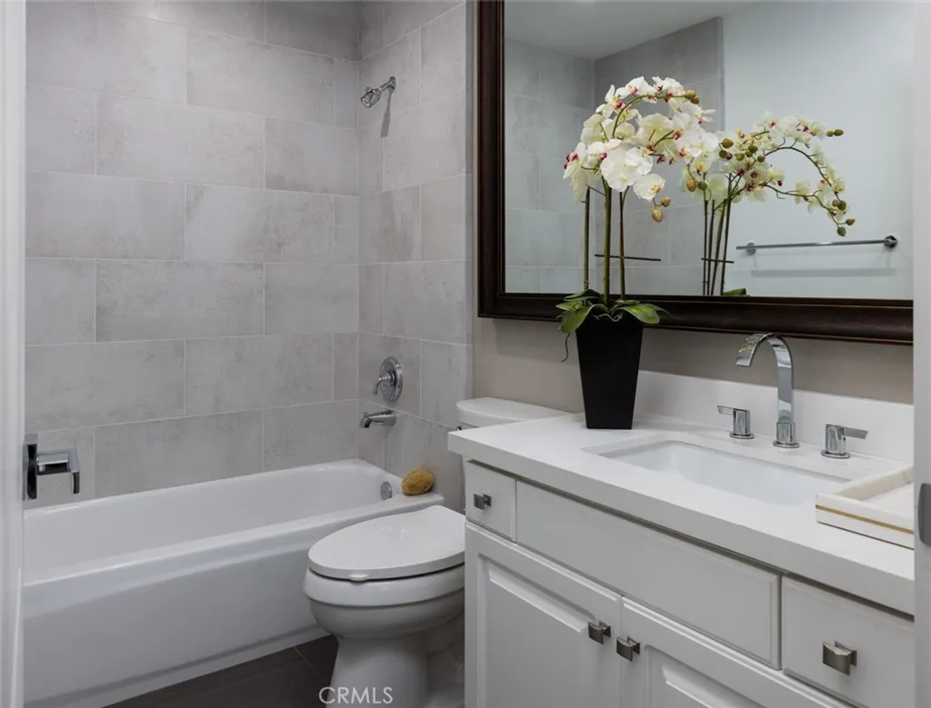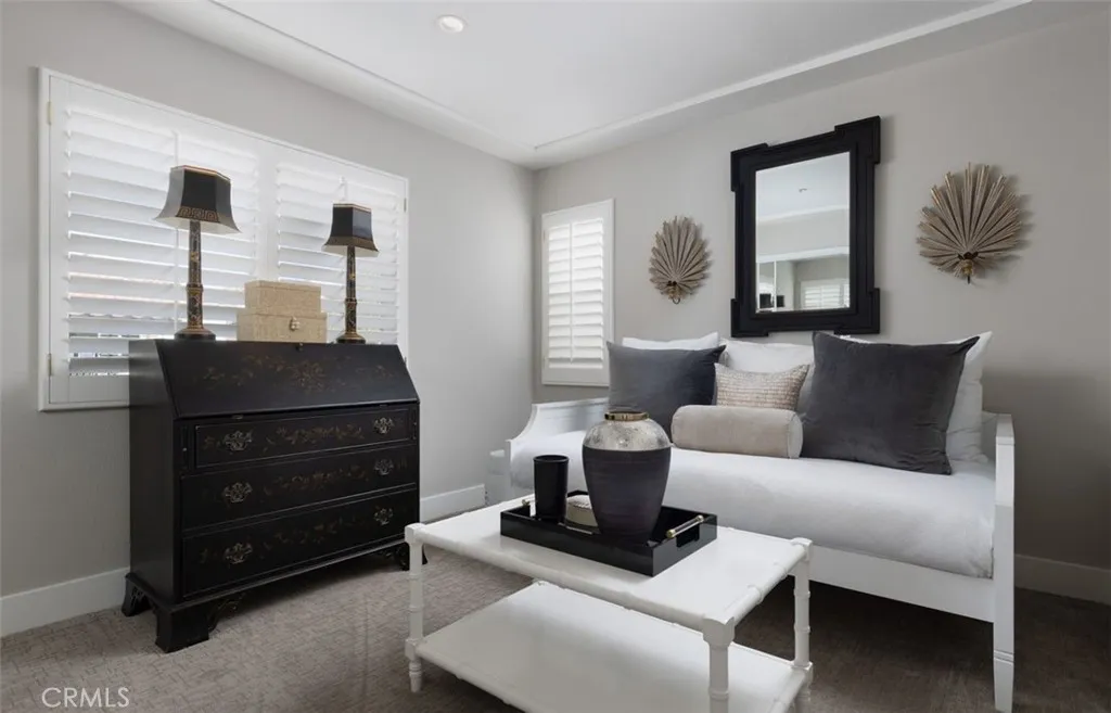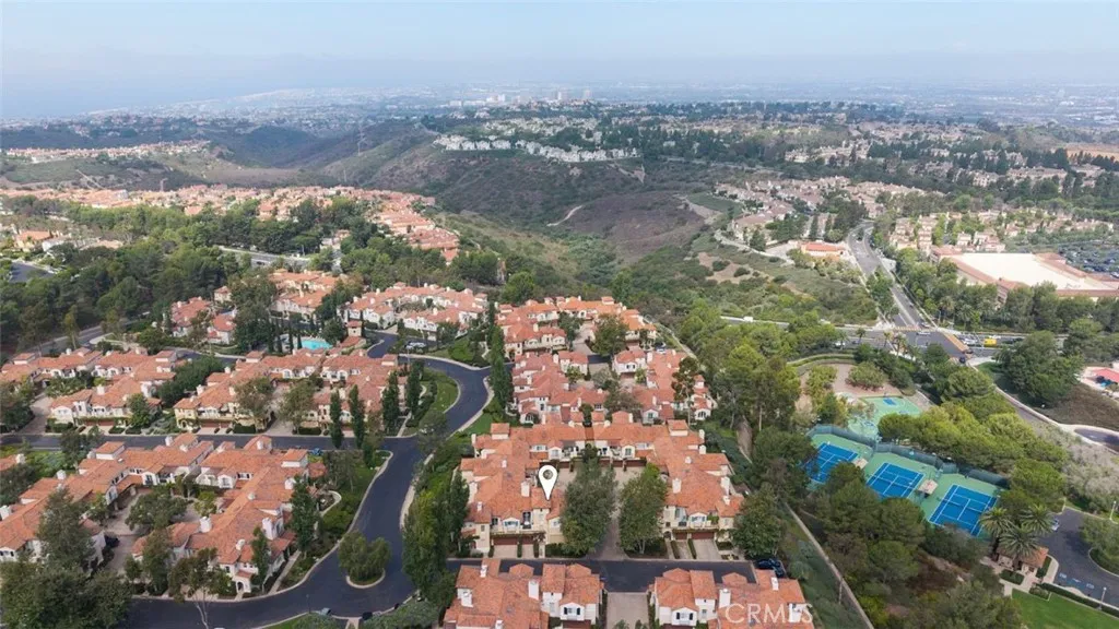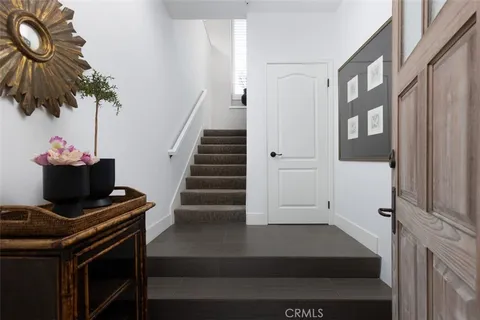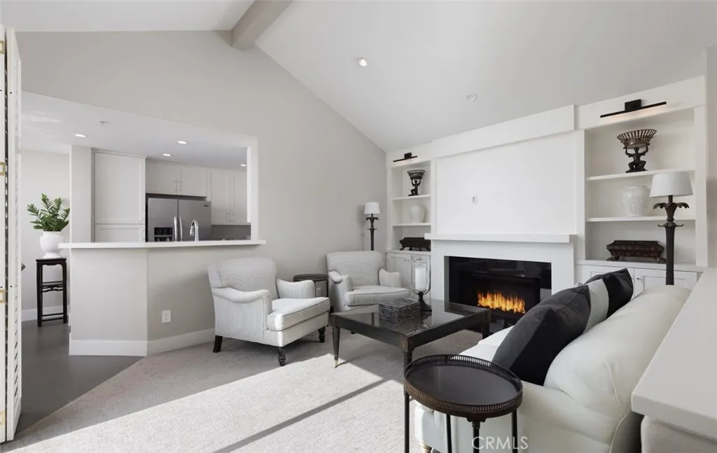 This professionally curated 2-bed, 2-bath home spans approx.1,326 sqft. and offers a seamless blend of coastal elegance and modern comfort. This coveted, corner location is very quiet with no neighbors above or below, in the exclusive gated community of Trovare in Newport Coast. The open-concept layout is enhanced by vaulted ceilings, custom wood beams, rich lacquered moldings, and abundant natural light. The gourmet kitchen features white cabinetry, quartz countertops, subway tile backsplash, stainless steel appliances, and flows into a spacious living and dining area with a fireplace and direct access to a private deck, ideal for al fresco dining or relaxed entertaining. Every inch has been thoughtfully upgraded. All recessed lighting has been replaced with high-efficiency 3000K LED fixtures, and every switch, outlet, and dimmer has been modernized for optimal lighting control. The living and dining areas showcase bespoke built-ins with added storage and quartz shelving, while the fireplace wall features black absolute granite surround, a wood-paneled mantle, lacquered cabinetry, and elegant shelving - creating a striking focal point. The primary suite offers a customized walk-in closet, sliding door entry, and access to the upstairs deck via a new insulated glass door. The en-suite bathroom includes new recessed lighting, updated fixtures, quartz countertops, new sinks and faucets, and custom-framed mirrors that extend to the ceiling. The secondary bathroom has been remodeled with large-format porcelain tile, a new quartz vanity top, oversized mirror, updated lighting, and modern fixtures. In the second bedroom, a tray ceiling with detailed molding and recessed lighting adds architectural interest. Additional upgrades include new custom white vent covers, oversized chrome door levers and hinges, updated cabinet hardware, a new GE dishwasher, garbage disposal, and a custom gas fireplace log set. The oversized 2-car garage features a new epoxy floor and built-in cabinetry for optimal storage. Trovare is in the process of painting these lovely homes, a soft Neutral palatte. Residents of Trovare enjoy exclusive access to resort-style amenities, including a saltwater pool, spa, tennis and pickleball courts, clubhouse, and manicured greenbelts. Ideally located near Crystal Cove, Pelican Hill, Fashion Island, and Newport's world-renowned beaches and dining, this turnkey home offers thoughtful customization, designer elegance, and elevated coastal living.