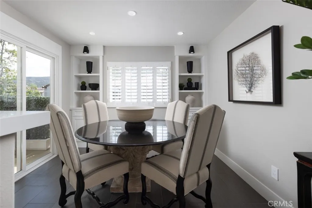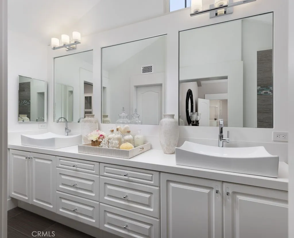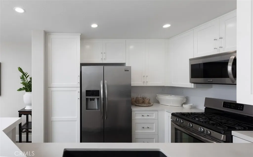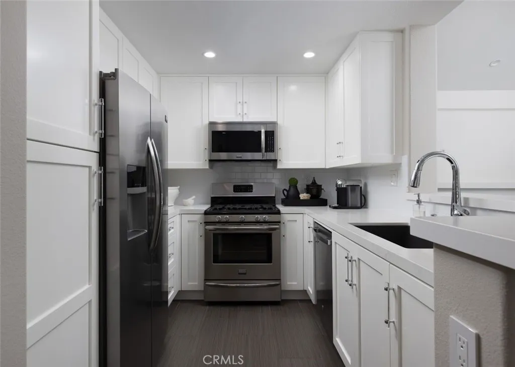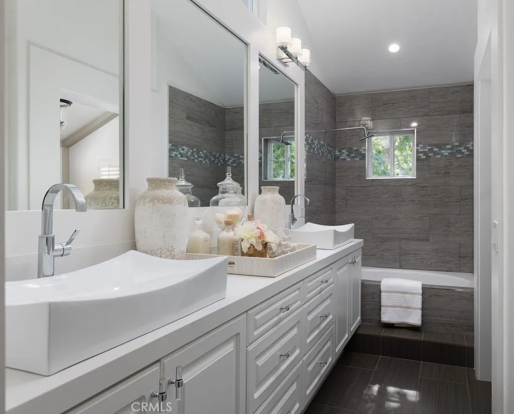 This professionally curated 2-bed, 2-bath home spans approx.1,326 sqft. and offers a seamless blend of coastal elegance and modern comfort. This coveted, corner location is very quiet with no neighbors above or below, in the exclusive gated community of Trovare in Newport Coast. The open-concept layout is enhanced by vaulted ceilings, custom wood beams, rich lacquered moldings, and abundant natural light. The gourmet kitchen features white cabinetry, quartz countertops, subway tile backsplash, stainless steel appliances, and flows into a spacious living and dining area with a fireplace and direct access to a private deck, ideal for al fresco dining or relaxed entertaining. Every inch has been thoughtfully upgraded. All recessed lighting has been replaced with high-efficiency 3000K LED fixtures, and every switch, outlet, and dimmer has been modernized for optimal lighting control. The living and dining areas showcase bespoke built-ins with added storage and quartz shelving, while the fireplace wall features black absolute granite surround, a wood-paneled mantle, lacquered cabinetry, and elegant shelving - creating a striking focal point. The primary suite offers a customized walk-in closet, sliding door entry, and access to the upstairs deck via a new insulated glass door. The en-suite bathroom includes new recessed lighting, updated fixtures, quartz countertops, new sinks and faucets, and custom-framed mirrors that extend to the ceiling. The secondary bathroom has been remodeled with large-format porcelain tile, a new quartz vanity top, oversized mirror, updated lighting, and modern fixtures. In the second bedroom, a tray ceiling with detailed molding and recessed lighting adds architectural interest. Additional upgrades include new custom white vent covers, oversized chrome door levers and hinges, updated cabinet hardware, a new GE dishwasher, garbage disposal, and a custom gas fireplace log set. The oversized 2-car garage features a new epoxy floor and built-in cabinetry for optimal storage. Trovare is in the process of painting these lovely homes, a soft Neutral palatte. Residents of Trovare enjoy exclusive access to resort-style amenities, including a saltwater pool, spa, tennis and pickleball courts, clubhouse, and manicured greenbelts. Ideally located near Crystal Cove, Pelican Hill, Fashion Island, and Newport's world-renowned beaches and dining, this turnkey home offers thoughtful customization, designer elegance, and elevated coastal living.