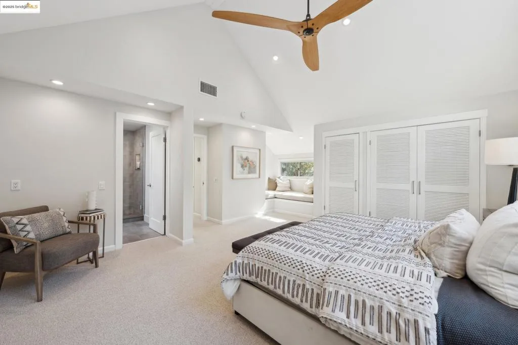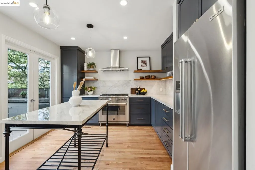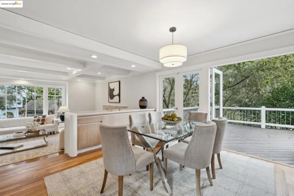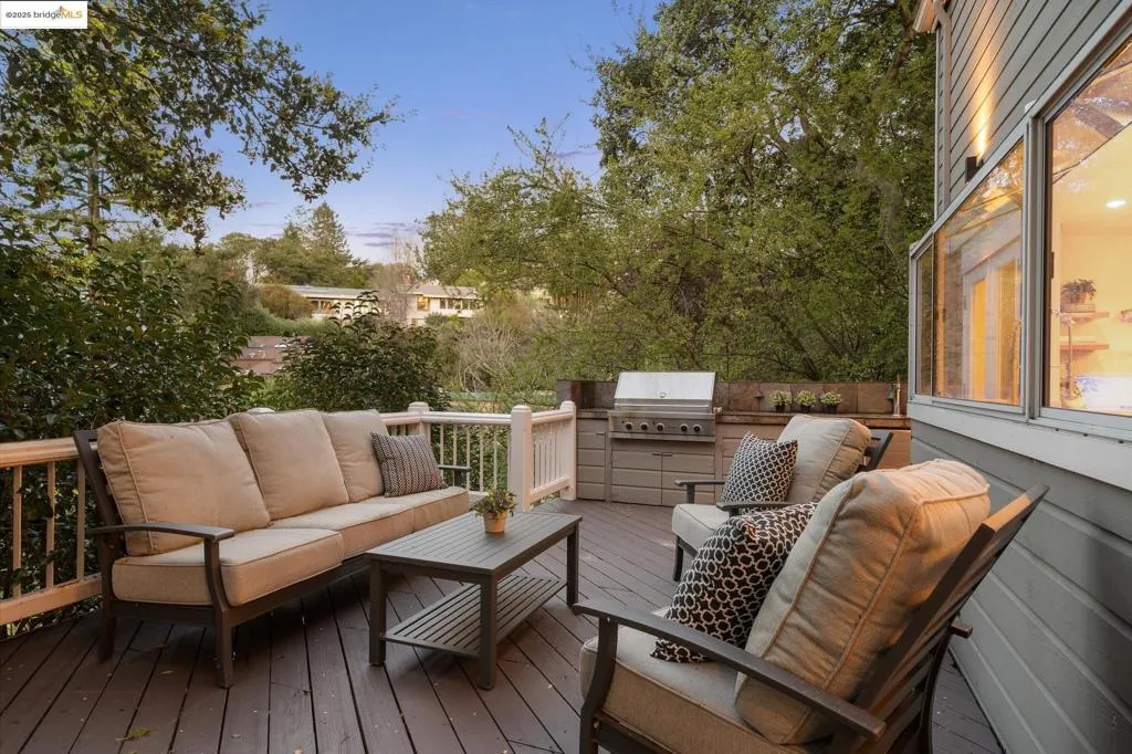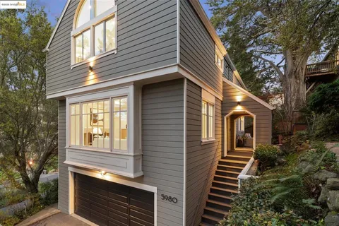 Graceful Montclair home, right on the Piedmont border. Nestled on an oak-studded hillside, this modern retreat is beautifully updated and surrounded by peaceful garden spaces for entertaining - just down the hill from Montclair Village s restaurants and shops. An expansive open-concept layout awaits just through the front door, seamlessly connecting the spacious living room, dining room, and architect-designed custom kitchen. Remodeled in 2019, the kitchen features custom cabinets, stunning marble countertops and backsplash, 36 Bertazzoni range, and a wall of windows overlooking the large deck with outdoor kitchen. A true entertainer s delight! Rounding out the main floor is an office and half bathroom. Up the stairs are two gracious bedrooms, two designer bathrooms, and laundry. The large primary suite features a sitting area overlooking the garden and attached en-suite bathroom with soaking tub. A perfect relaxing retreat. Down from the main level is the third spacious bedroom, high-end wine storage, and oversized two car garage. Nearby to multiple parks, centrally located between Upper Rockridge, Piedmont and Montclair, and easy access for commuters. Newer furnace and AC (2019 & 2021), tankless water heater (2022), new 200 amp panel + Tesla charger (2019).