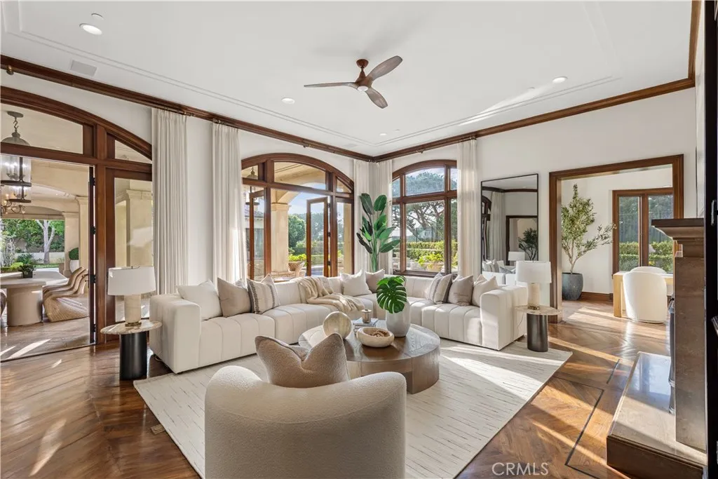 Set on a rare double lot just steps from the Pacific Ocean, 7 Shoreview is acclaimed as one of Pelican Point's most significant architectural estates - a gated coastal compound conceived for multigenerational living, privacy, and timeless design. Encompassing approximately 11,000 square feet, the residence commands over half an acre of manicured grounds with serene golf course and garden views, located within Newport Coast's only oceanfront, guard-gated enclave with private access to Crystal Cove State Beach. Crafted by master artisans, the home blends hand-selected woods, honed natural stone, wrought iron, and classical detailing, creating interiors that feel warm, enduring, and deeply refined. A dramatic sequence of formal living and dining spaces gives way to a wood-paneled library, expansive chef's kitchen, multiple family lounges, and a day-lit lower level designed for wellness and recreation - complete with a steam-room and elevator. French doors throughout dissolve the boundary between indoors and out, leading to a true resort environment: a sparkling pool and spa, pool pavilion with kitchenette and bar, outdoor fireplace, and a collection of covered and open-air terraces that form a series of intimate outdoor retreats. Mature trees and sculpted gardens envelop the property, reinforcing its sense of seclusion. Designed for modern family life, the estate features two main-level guest suites ideal for in-laws or guests, and an expansive primary retreat with sitting room and spa-inspired bath with heated floors. An oversized four-car garage adds convenience and functionality to the compound layout. All of this sits within Pelican Point - the only community in Newport Coast west of Pacific Coast Highway - offering 24-hour guard-gated security, direct gated access to the sand, and proximity to the Resort at Pelican Hill, Crystal Cove Promenade, and the best of coastal Orange County.