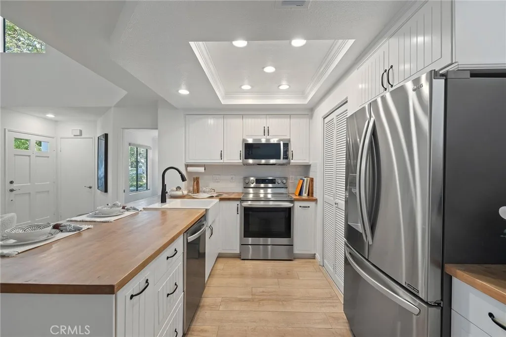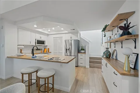 Welcome to 83 Briarglen, located in the highly desirable Woodbridge community of Irvine. Master Suite on the main level. This beautifully upgraded end unit townhome offers 2 bedrooms plus an office which can used for a 3rd bedroom and 2 full bathrooms, including a convenient main-floor bedroom and full bath. Flooded with natural light, this end unit features an open-concept floor plan with built-ins, numerous windows, vaulted ceilings, and a cozy fireplace that creates a warm and inviting atmosphere. The sliding door opens to a spacious private patio, providing a serene outdoor retreat perfect for entertaining or relaxing. The updated kitchen offers edge grain butcher block countertops, stainless steel appliances, an apron farmhouse sink, and ample linear design cabinetry. The in-unit laundry room is conveniently located just off the kitchen. Upstairs, the spacious primary suite offers privacy and comfort, while an enclosed loft area provides a versatile space ideal for a home office, guest room, or den. Additional highlights include wide plank engineered hardwood floors throughout, including the stairs, recessed lighting, and a detached, enclosed one car garage. Located just steps from Briarglen Park, offering a swimming pool, spa, volleyball court, and large grassy areas perfect for outdoor fun. Enjoy the exceptional amenities of the Woodbridge community, including lakes, Lagoons, additional pools, spas, tennis courts, and parks. Situated in the award-winning Irvine Unified School District. World-class shopping, dining, and easy freeway access complete this fantastic opportunity. Schedule your private showing today.